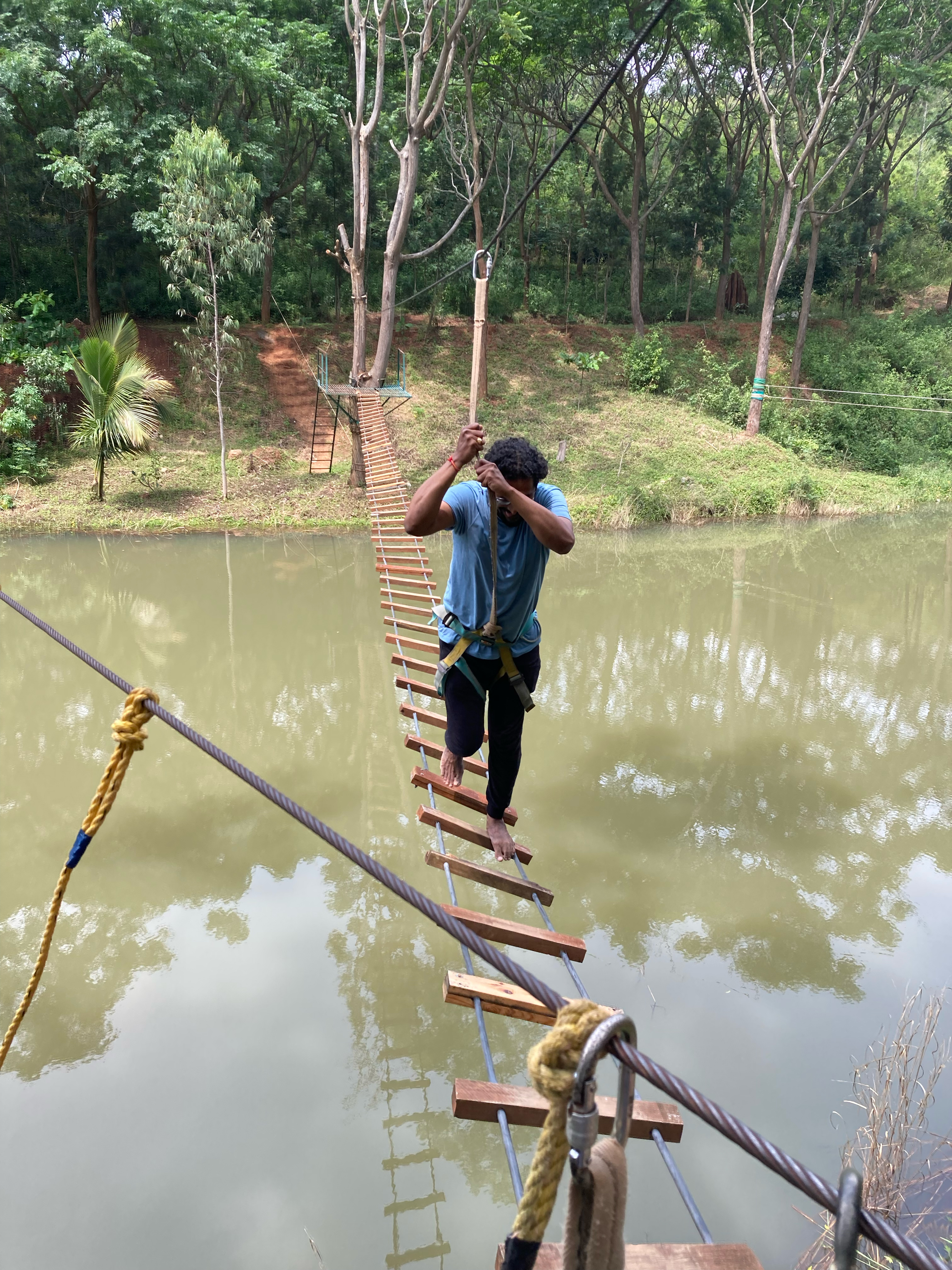 The first thing that I tried was the Burma bridge, it was easy as compared to the Egyptian ladder. Unlike the side ropes that you can hold while crossing the river on the Burma bridge, an Egyptian ladder doesn’t provide any such support. You will have to hold the harness that is connected at the top rope and cross the ladder.