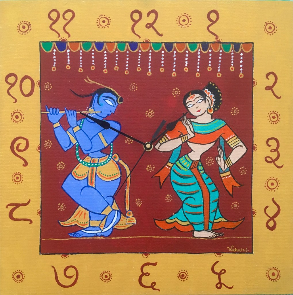 Was inspired by paintings and compositions of famous painter, Jamini Roy and fused the Radha Krishna dancing pose with traditional Devanagari numerals to complete the clock.