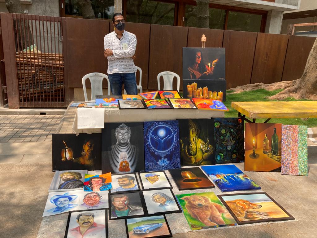 My stall was located on the entrance of Crescent Road, which is opposite to the entrance of CKP. I was a bit disappointed, as it is the main road (Kumarapark road) that receives the maximum crowd as compared to the lanes. However, I arranged all my artworks neatly and ensured visibility to everyone passing through my stall.