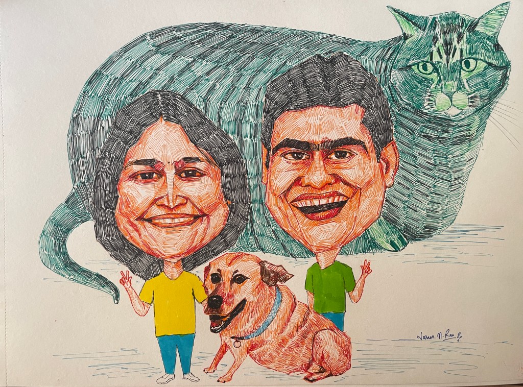 A family #caricature for my sis @rao.aarathi and bro in law @rao.ravish whom I met after 12 long years. The cat is Little Bit and the dog is Peanut 😍😍
